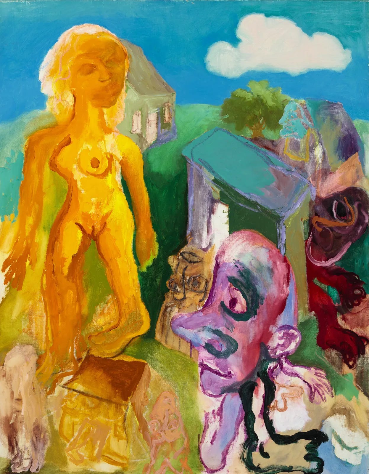 Kiff’s work features a recurring cast of “relational” symbols that act out psychic dramas across his canvases. Central to this iconography is the “Little Man” (or “The Pilgrim”), a naked, round-headed figure who serves as a proxy for Kiff himself. This figure is frequently depicted making his way through a world of marvels and dismay, occasionally beset by ominous forces. In contrast, the “Radiant Woman” (or “Goddess”) appears as an elemental and monumental figure, symbolising luminosity and power. These figures often appear as goddesses or earth nymphs, functioning as structural anchors that stabilise the painting’s composition through their vibrant pigment. This symbolic language extends to the anthropomorphic landscape, where sentient environments feature houses, stellar bodies and natural elements imbued with human qualities.
