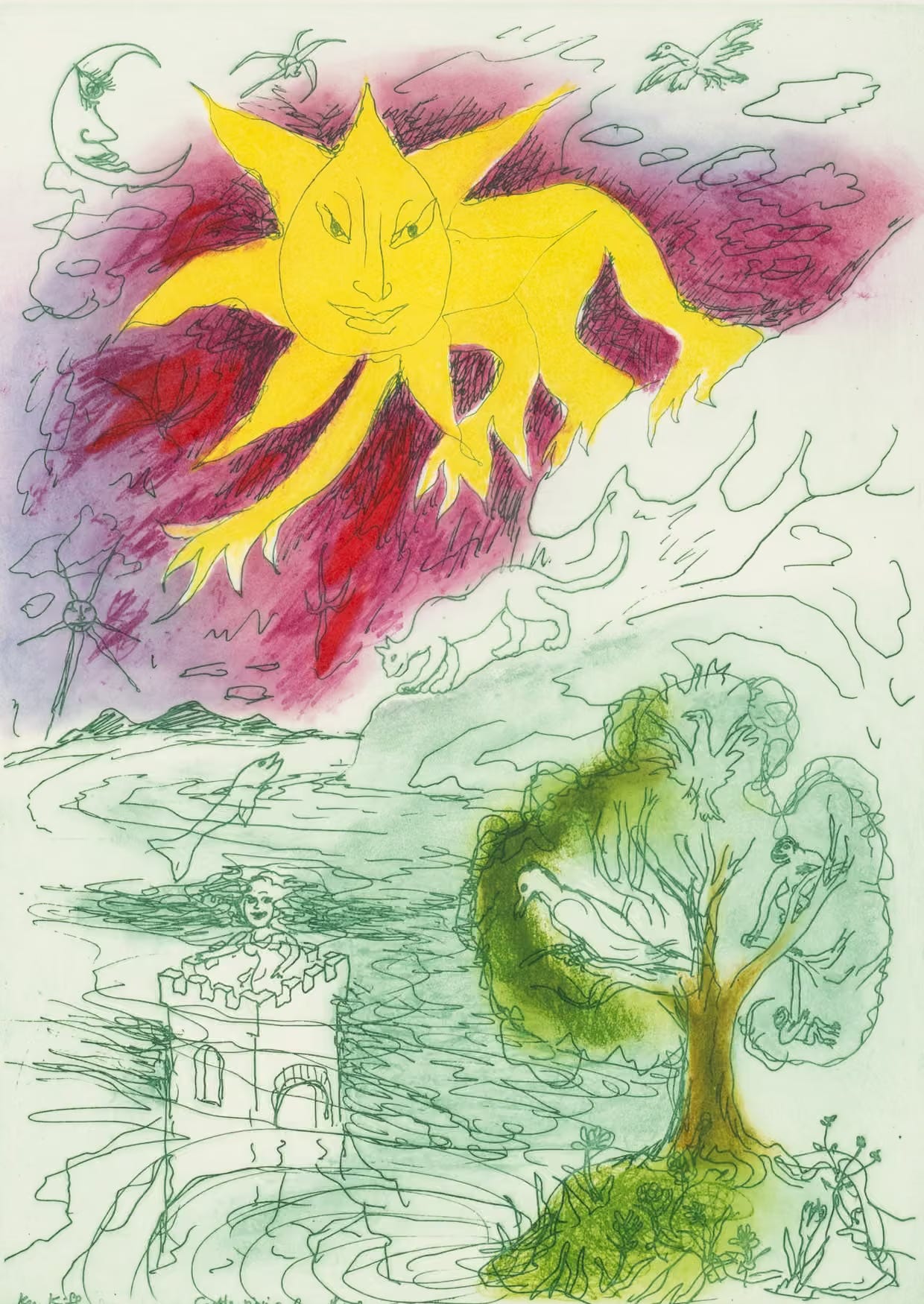 In a 1985 article discussing Ken Kiff’s work, Martha Kapos used the phrase “realism of the psyche”, which she borrowed from Marc Chagall, to describe how Kiff’s radical approach to restructuring the painted image and his liberation of colour enabled him to expand and transform the representation of reality. Kiff (1935–2001) was indeed a singular figure in late 20th-century British painting, celebrated for his unique ability to fuse modernist pictorial values with a deeply personal mythology, offering a psychologically complex alternative to the conventional storytelling and Neo-expressionism of his time.