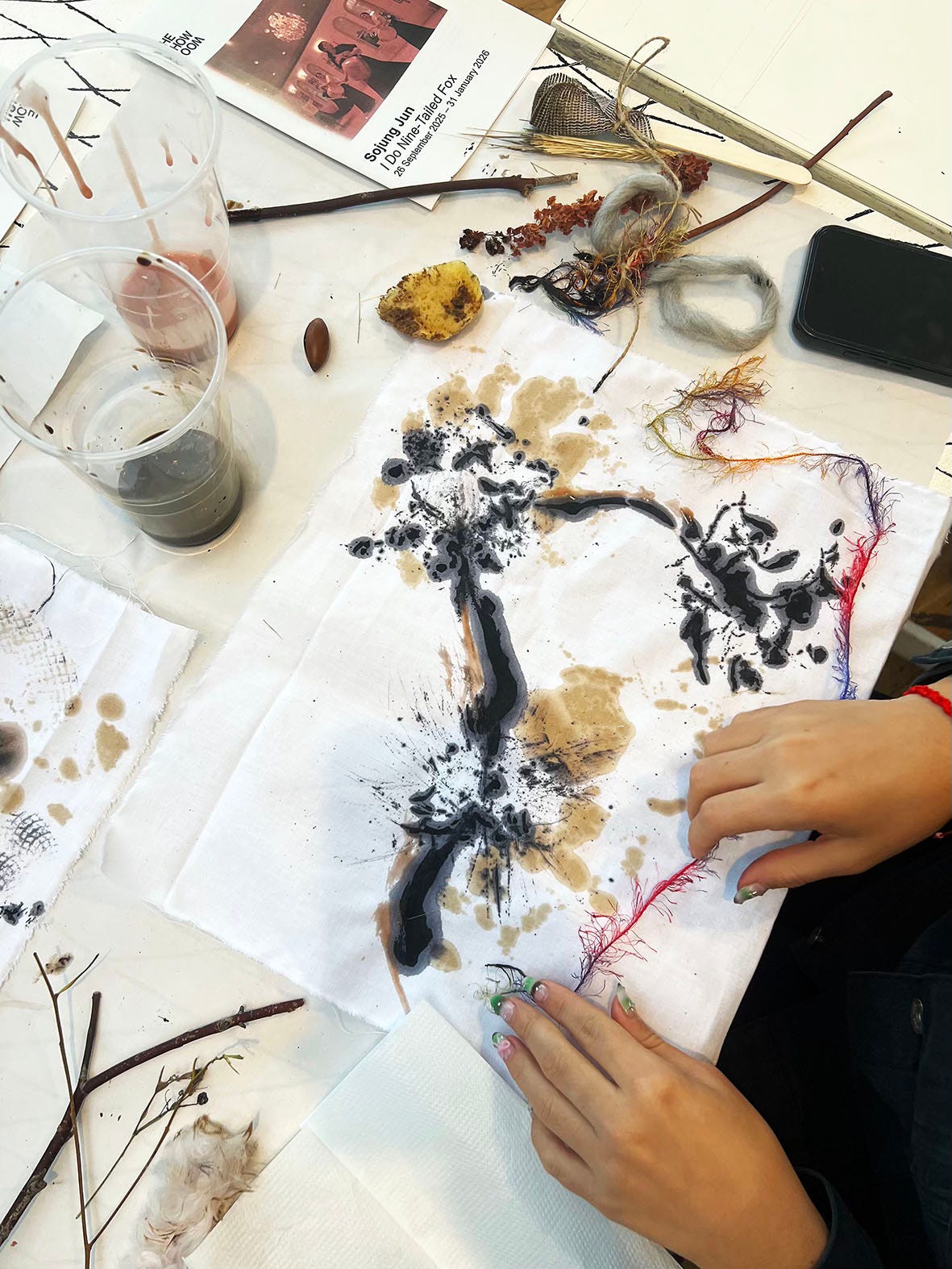 Kim Chin: I would say my practice is interdisciplinary, with an overarching decolonial thread running through everything I do. I typically work with textiles, printmaking, and natural dyes in order to minimise material waste. Much of my work takes place in public and collective settings, such as workshops and gatherings.